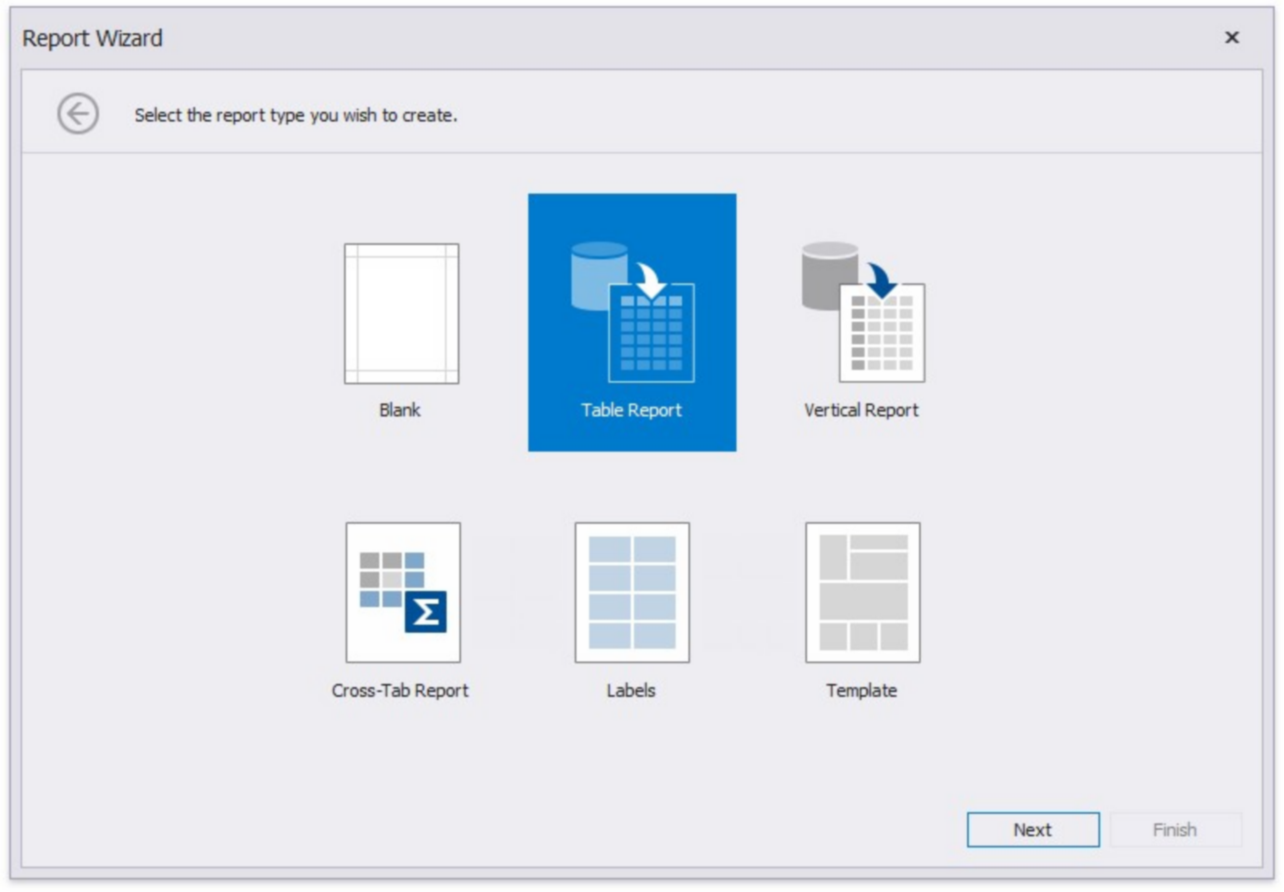 On this wizard page, you can choose the report type you want to create.